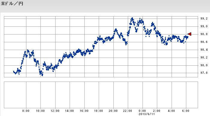 ドル円相場も日本時間の6:15には約98.80円と少し円高へ戻りつつあります。