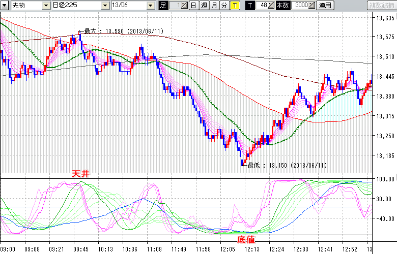 指標ラインの密集点が天底・転換点を示します。指標の見方