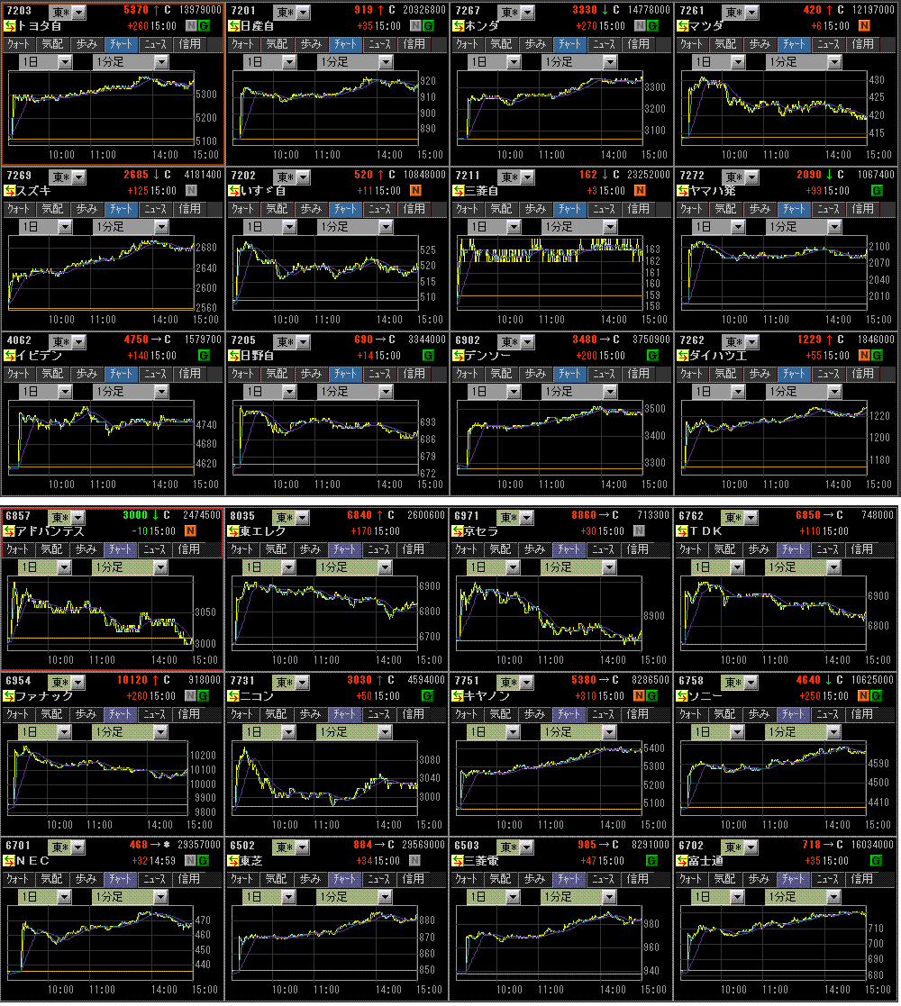 米株高、円安進行を受けて大幅続伸。TOPIXへの寄与度が高いトヨタやホンダなど自動車株が強く、任天堂も強かったため、日経平均よりもTOPIXの方が上昇率が高かったです。NECの営業利益上方修正やUBSによる東芝の格上げなどで電機株も強かったです。あと、全般的に大型株の方が買われていたようですね。大型株が買われてTOPIXが強かった反面、日経平均先物への売り圧力がややあるなと感じました。