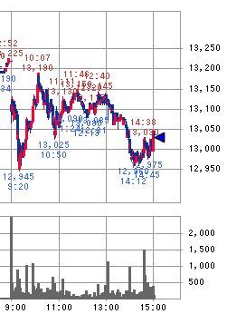 こうした買い支えの効果が出たのか12:45頃に13,145円位まで値戻しすることに成功しましたが、13:00頃に出来高が増えて下落が始まり、14:00頃にも出来高が増えて下落が加速していって14:12頃に本日の最安値12,966.41円へ下落して13,000円割れへ再び追い込まれる形になりました。