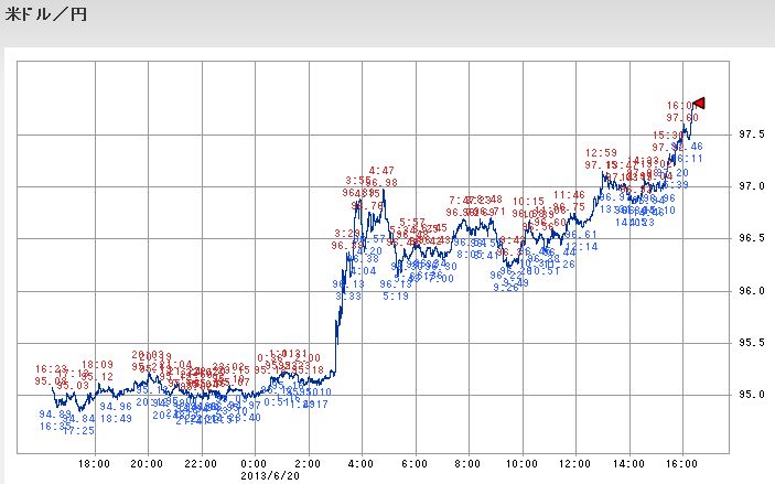 97円台まで突入した円安ドル高は東証の時間帯中もほぼ右肩上がりにドル高となっていますが、NYダウや中国などの株安効果の方が上回ってしまったようです。