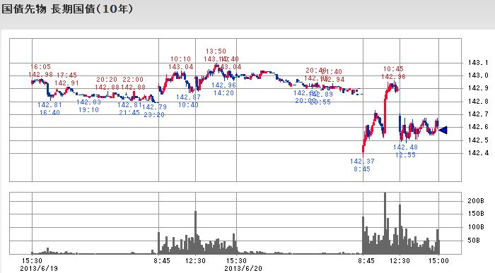 その後は戻りを試して10:10頃に13,190.82円に迫る本日の最高値をつけて順調に値戻しするかに見えましたが、そこから再び急落して10:50頃に13,000円に迫るところまで下落しており、中国のPMIの悪化と米国FOMC後の会見で明らかになった金融緩和縮小観測によるアジア株の相場下落の影響が前場から既に現れていました。