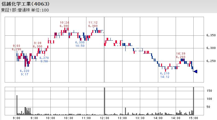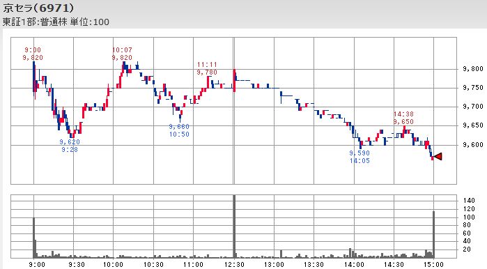 しかし、京セラが前日比-470円の14,200円と日経平均よりも大きな3%強の下落となったほか、信越化学も前日比-180円の6,210円と3%弱の下落となるなど大きく下落して、平均株価の下落を大きくする形となりました。