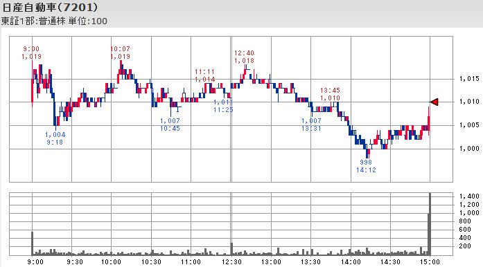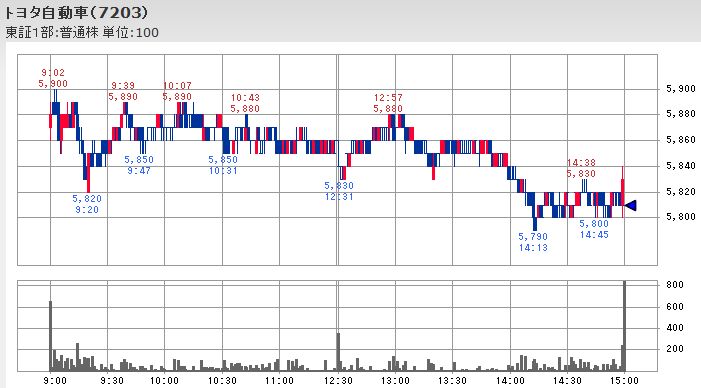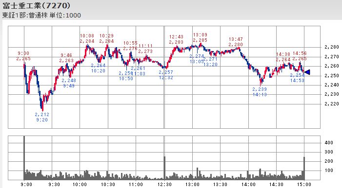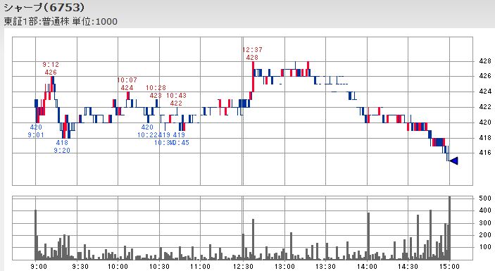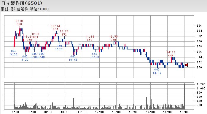 なお、日立とシャープは共に大引けの出来高が本日の最大となっている点は同じですが、日立は株価の買い支えの様に見えるのに対して、シャープは14:30以降に何度か出来高の増加を伴って下落が進んだ延長線上での売り仕掛けの影響に様に見えます。