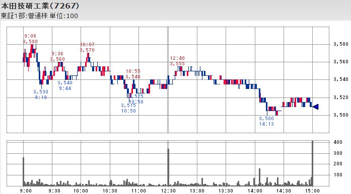 これに対して、ホンダは輸出比率が高く円安ドル高のメリットを受ける銘柄とされているせいか、前日比-55円の3,510円と日経平均の下落率よりも小幅な下落になっており、やはり円安ドル高の効果は全くなかったわけではないことが判ります。