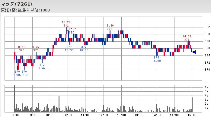 1円の円安ドル高で400億前後の増益になるとされるトヨタが前日比-60円の5,810円と日経平均の下落率を下回ったほか、マツダに至っては平均株価の下落に反して前日比+8円の375円と2%強のプラスとなり、ホンダは日経平均の下落率よりも小さかったものの-55円の3,510円とトヨタよりも下落率が高くなっています。