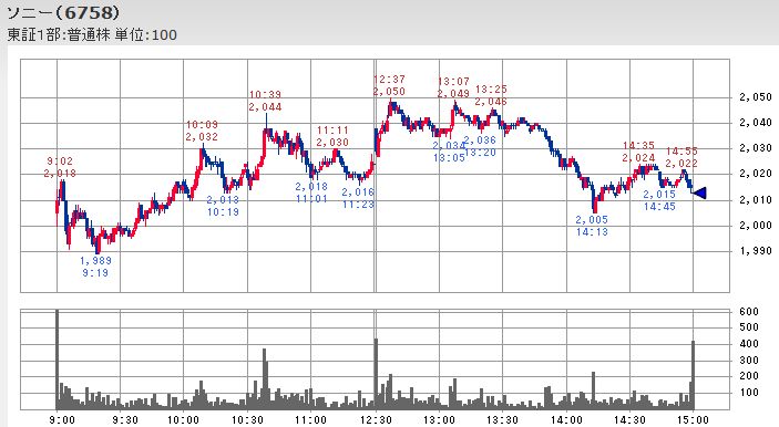しかし、輸出比率が高いソニーは前日比-2円の2,013円とほぼ前日と同じ株価を維持しています。
