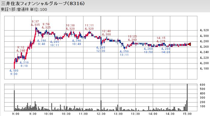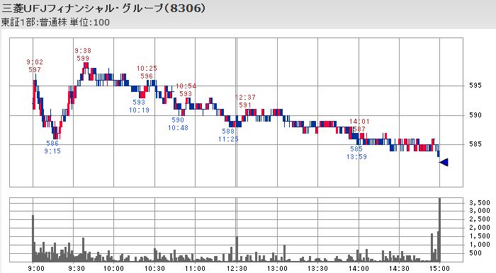 また、三井住友と三菱UFJは株価の買い支えの対象となったのか、大引けの出来高が本日最大となっているのも特徴的に見えます。