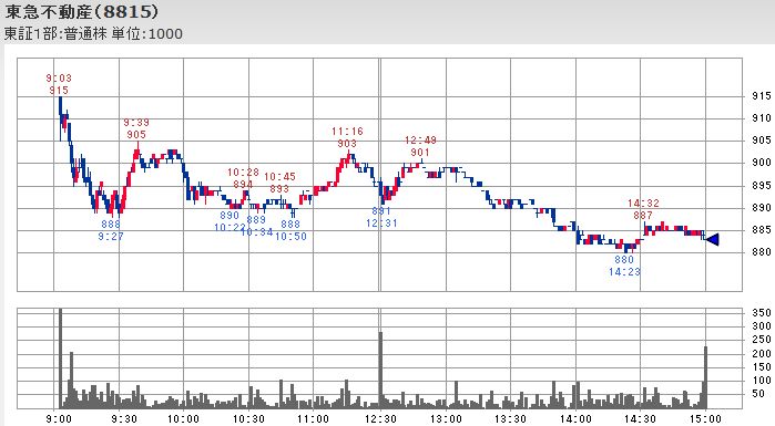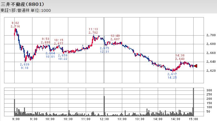 特に三井不動産は前日比-105円の2,631円と約4%の下落、東急不動産は前日比-52円の883円と6%弱の下落と大きな下落となっています。