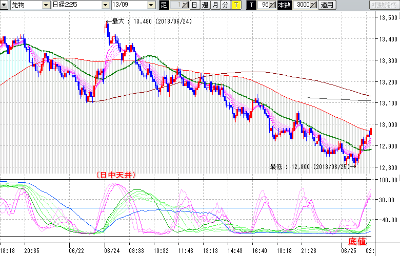 指標ラインの密集点が天底・転換点を示します。指標の見方