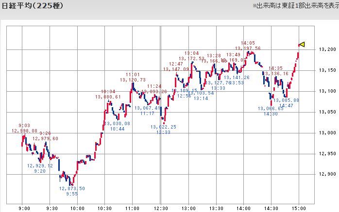 ところが、14:00に始まった香港市場と上海市場の指数が前日比プラスこそ保っていたものの14:10頃から14:40頃まで共に急落する形となったことを受けて売り仕掛けが入り、折角急上昇していた日経平均も14:30に13,066.65円、14:47に13,085.88円へと逆M字型で急落してしまいました。
