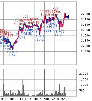 そして、香港のハンセン指数や上海総合指数 (SHCOMP) 指数は前日比プラス1%を超える上昇で始まり、その後もアップダウンを繰り返したものの前日比では収支プラスを保っていたことを支援材料としてやはり先物への買仕掛けが入って11:01には13,120.73円まで上昇し、前場の引けの頃でも13,100円を少し割り込む程度という高い水準で終わることが出来ました。