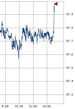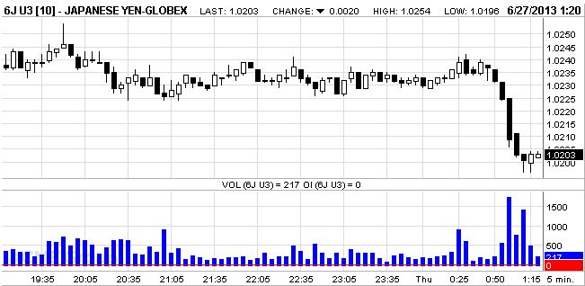 日本時間14:45(シカゴ時間0:45)からドル円先物が円安ドル高へ転じ、特に東証の大引け直前の時間にあたる日本時間15:00(シカゴ時間1:00)頃に出来高が急増して97.7円から約98.0円まで急速に円安ドル高が進む仕掛け的な円売りが入っています。