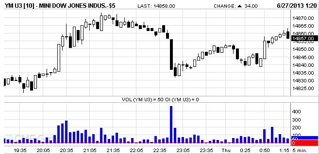 日本時間14:45(シカゴ時間0:45)からシカゴグローベックスのドル円先物が円安ドル高へ転じ、特に東証の大引け直前の時間にあたる日本時間15:00(シカゴ時間1:00)頃に出来高が急増して97.7円から約98.0円まで急速に円安ドル高が進む仕掛け的な円売りが入っていますし、同じように日本時間14:45(シカゴ時間0:45)からシカゴグローベックスのダウ平均先物も上昇へ転じ、特に東証の大引け直前の時間にあたる日本時間14:50(シカゴ時間0:50)頃にはその直前よりも出来高が急増するなど仕掛け的な買いが入ったことによって14,840ドルから14,855ドルへ比較的急速に上昇するなど本日はシカゴグローベックスの先物市場参加者も日経平均の上昇にとても協力的だったのです。