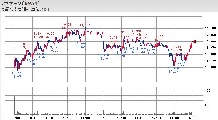 しかし、ファーストリテイリングが前日比+900円上昇して日経平均並みの約3%上昇したに対して、ファナックは最近の世界の株価や経済の低迷に伴う設備投資の伸び悩みへの懸念が残っているのか前日比+200円と約1.4%の上昇率に留まっており、明暗がくっきり分かれています。