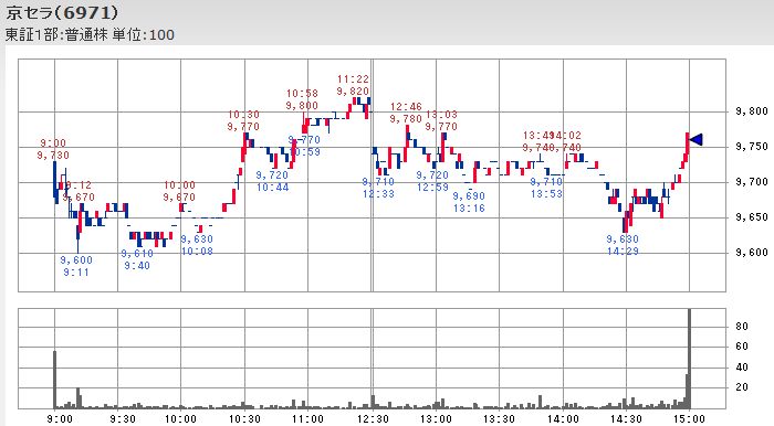 また、信越化学が前日比+200円でホンダが前日比+110円と共に日経平均並みに上昇したのに対して、京セラは前日比+120円と上昇率が日経平均を下回っているという違いがあります。