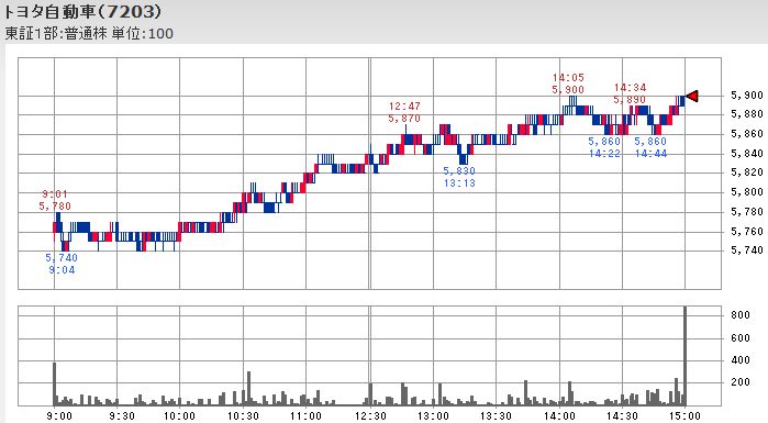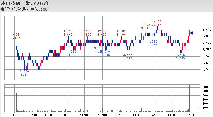 こうした大引けでの大きな成り行き注文による買い仕掛けなどが功をそうしたのか、トヨタは終値が本日の最高値でホンダとマツダも最高値に近くなっています。