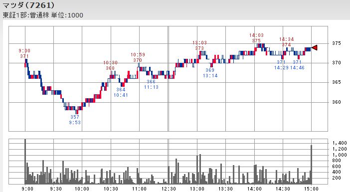 また、マツダもそこまでは大引けの出来高が多くなっているわけではありませんが、朝の寄付きより少し下回るくらいまで急増しており、トヨタやホンダと同じように機関投資家同士の最後の株価の攻防が行われたことを物語っているように思われます。