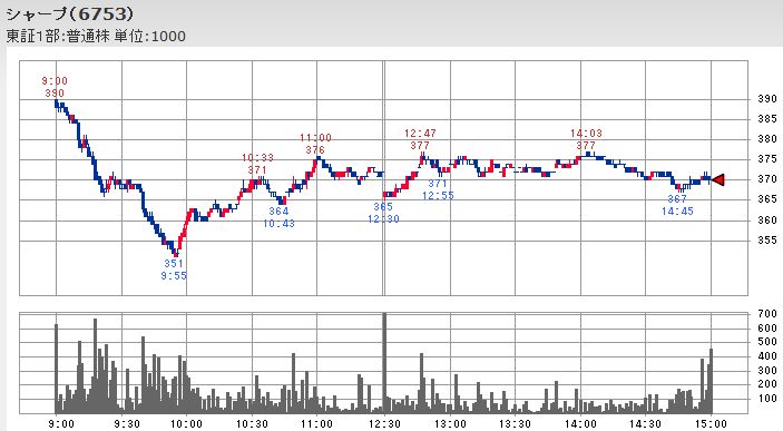 本日はソニーは前日比+34円、日立は前日比+4円の上昇となっていますが両社共に日経平均の上昇率を下回っているほか、シャープは前日比-16円と東証一部では本日数少ない下落銘柄となっており、明暗が分かれると同時に何れも日経平均のような上昇とはなりませんでした。