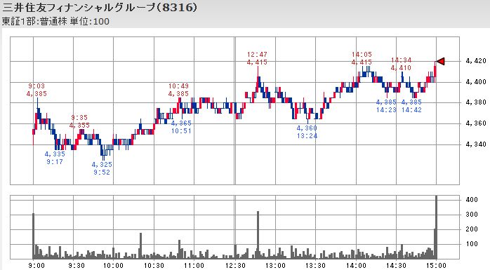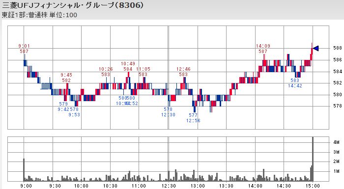 また、本日は3行共に大引けで出来高が朝の寄付きよりも多く本日最大となっています。