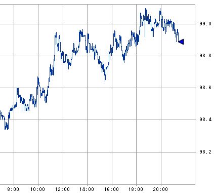 また、ドル円相場も10:50頃からシカゴグローベックスの先物へ何度か円売りドル買い的な出来高増加と共に急激に円安ドル高となって99円弱まで一時上昇したことも11:00以降の日経平均急上昇を支援したようです。