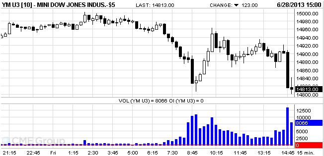 日本時間23:30(シカゴ時間10:30)に下落しているのは、東証の終値が高すぎたことを理由にしているのではなく、ほぼ同時間帯23:15(シカゴ時間10:15)でシカゴグローベックスのダウ平均先物価格が下落していることと並行して生じ、日本時間4:55(シカゴ時間14:55)に下落しているのは、ほぼ同時間帯でシカゴグローベックスのダウ平均先物価格が下落していることと並行して生じていますので、海外の株価に左右される展開が続いているだけと考えて良いと思います。