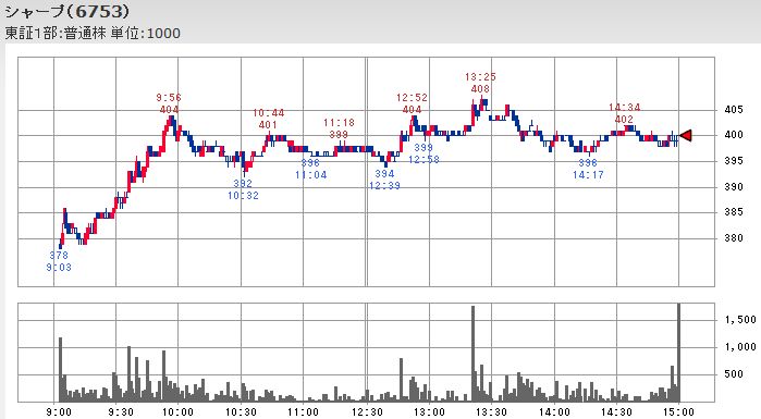 後場に入ってからも比較的堅調な展開が続いていましたが、先物の売り仕掛けを受けて14:37以降に急速に上昇幅を縮めていますが、14時台に後場が始まった香港のハンセン指数が弱含むと同時にシカゴグローベックスのダウ平均先物の価格も下落、ドル円相場もやや円高ドル安傾向になったことを受けて売り方が少し強気に転じたことが影響していると推測されます。