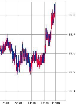 しかし、後場に入ってからは逆に13:30前後に99.55円から99.7円前後と14時台に99.65円から99.8円前後となった円安ドル高や、香港市場が13:14(日本時間14:14)前後から13:42(日本時間14:42)に、上海市場が13:12(日本時間14:12)前後から13:36(日本時間14:36)に、シカゴダウ平均先物が0:15(日本時間14:15)前後から1:00(日本時間15:00)に堅調に推移し始めたことを材料に売り仕掛けが入って上昇し、後場だけで13,945.47円から14,098.74円と約150円近く上昇して終えています。