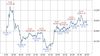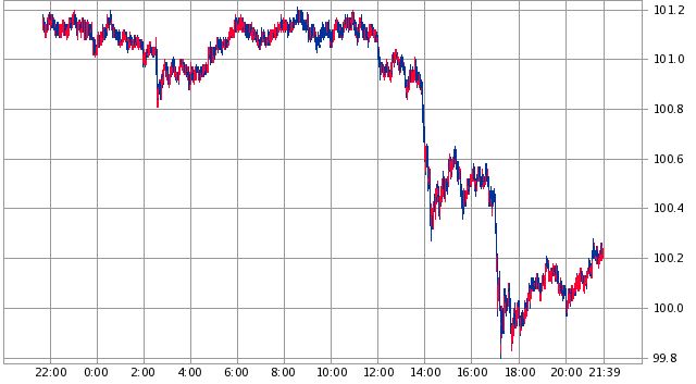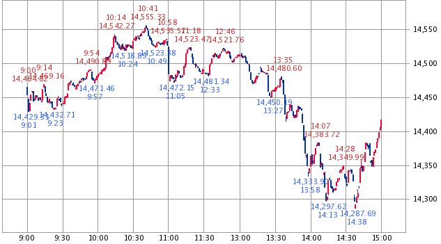 しかし、その後は13:34の101.01円から14:15の100.27円へ急速に円高ドル安が進むと共に、それと並行して日経平均も13:35に14,480.60円とほぼ値を消す形となり、13:50頃の14,440円から13:58の14,333.90円へ10分ほどで100円以上急落したのを皮切りに、14:07の14,383.72円から14:13の14,297.62円へ6分で約86円と急落を繰り返し、14:38に本日の最安値14,287.69円に達しました。