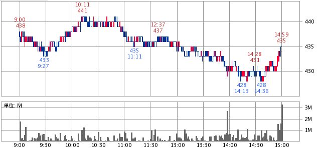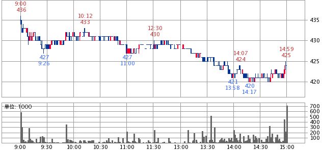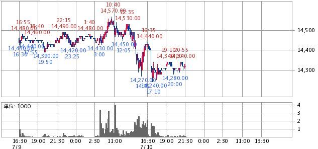 後場の寄り付きもほぼ前場の引けと同じ水準となった為日本時間12:33(香港時間11:33)に香港のハンセン指数が21,786.88香港ドルと少し値を戻していたことから、14,472.34円とほぼ前日比横ばいになっていましたが、12:46に後場の最高値14,521.76円をつけています。