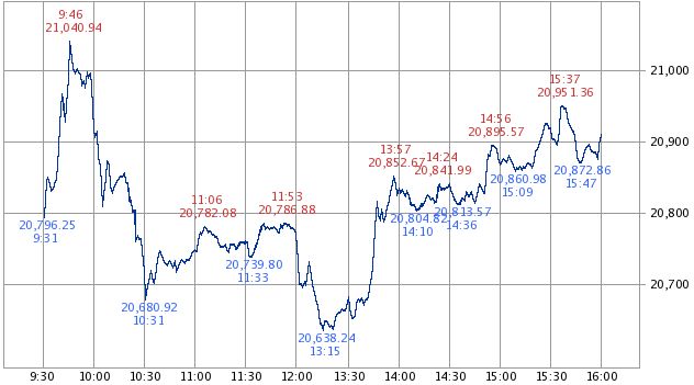 その後香港市場などが開いた後も、香港市場などが堅調だったことを支援材料として特に下落せず、10:41に14,555.33円と日経平均が本日の最高値をつけ、日本時間10:46(香港時間9:46)に香港ハンセン指数も21,040.94香港ドルと本日の最高値をつけるなど、同じような相場展開となりました。