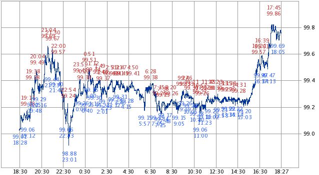 その後香港ハンセン指数などの伸び悩みを受けて日本時間15:30(シカゴ時間1:30)頃に日経平均は14,560円前後まで下落しましたが、日本時間16:00(シカゴ時間2:00)頃から日本時間16:30(シカゴ時間2:30)頃に1ドル99.2円強から99.6円弱へ、と日本時間17:15(シカゴ時間3:15)頃から日本時間16:45(シカゴ時間3:45)頃に1ドル99.5円前後から99.86円へ円安ドル高が進んだことを受けて、シカゴ日経平均先物も14,620円から14,675円まで上昇して12日の日経平均の終値よりも大幅な上昇となっています。