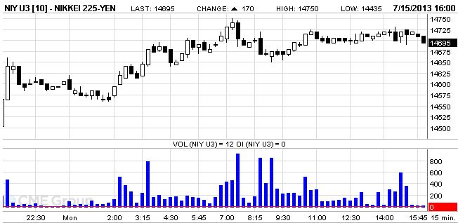 昨晩までのシカゴ日経平均先物はNYダウと香港ハンセン指数やシャンは総合指数が7月12日より上昇したため、シカゴ時間16:10(NY時間17:10、日本時間6:10)で14,695円(7月12日:14,580円、東証終値比+189円)とNYダウより大きく上昇しています。