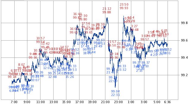 なお、NYダウより大きく上昇した理由は、米FRB議長の議会証言を好感してNYダウがNY時間11:51(日本時間22:51、シカゴ時間12:51)からNY時間12:14(日本時間23:14、シカゴ時間13:14)に14,438.12ドルから14,482.35ドルへ上昇したため、NY外為市場はドルが上昇して日本時間22:31(NY時間11:31、シカゴ時間12:31)から日本時間23:50(NY時間12:50、シカゴ時間13:50)に99.0円から90.0円へに0.2円の円安ドル高となりましたが、