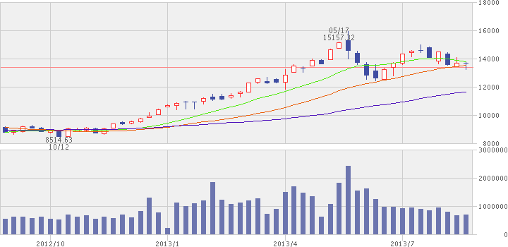 現在、日経平均は¥13,500~14,000の範囲で動いており、ここで¥14,000の壁を破り、26週線を超えて来ればまた上昇相場入りとなるも、ここで調整となると13週線が26週線を高値圏でDCすることになり、暫し調整が長引くことが懸念されるかと存じます。