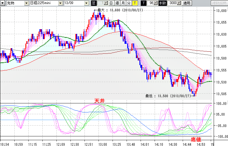 指標ラインの密集点が天底・転換点を示します。指標の見方
