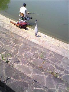 青サギが釣り人の魚を狙っています。釣り人はブルーギルはいらないのであげてしまいます。あじをしめてあおさぎが離れません。お互いに早く釣れないかなー!!!