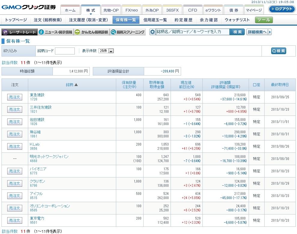 そんな中で、ゆきママの株口座は相変わらずです・・・。地味に東急建設(1720)や熊谷組(1861)の一部を損切りと利益確定をしました。これで-2万円ぐらいの取引となっているので、ここまでの確定益は+22万円(税引き後)。つまりあとちょっとでマイナスに転じるというギリギリの状態が続いています(つД<)・゚。クソー