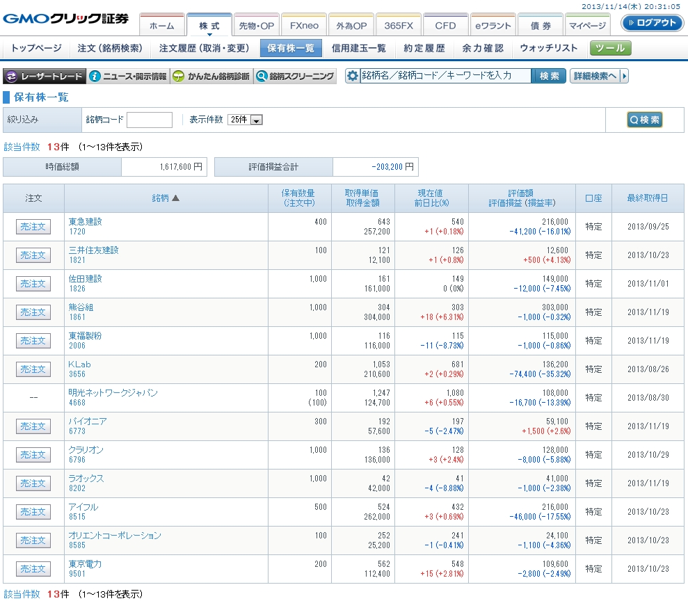 そんな中でゆきママの株口座はというとあまり変化がないというかなんというか(ノ∀`)アチャー ただ、今日はくまモン(熊谷組:1861)を高値で売って安値で買い戻すというスキャルトレードをして、確定益が+227,000円となっています。