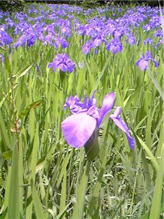 池には杜若がたくさん咲いていて花がいっぱいで橋が架けてある