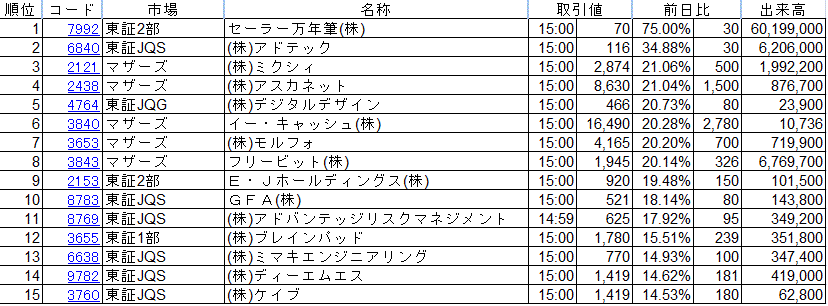 18 6627 マザーズ (株)テラプローブ 15:00 1,008 -6.15% -66 195,000 掲示板