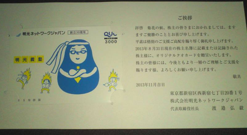 8月末に買った明光ネットワークジャパン(4668の株主優待が今日届きました(pq*´∀゚)ウレスィ~♪ 3,000円分のQUOカードです。クオカはコンビニでも書店でも大体どこでも使えるのが嬉しいですね。まぁ換金するにしても買取95%以上が普通ですし、おいしい優待でした。