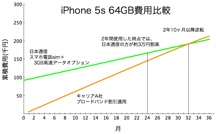 2年10ヶ月以降にはじめて日本通信+シムフリーが安くなる。