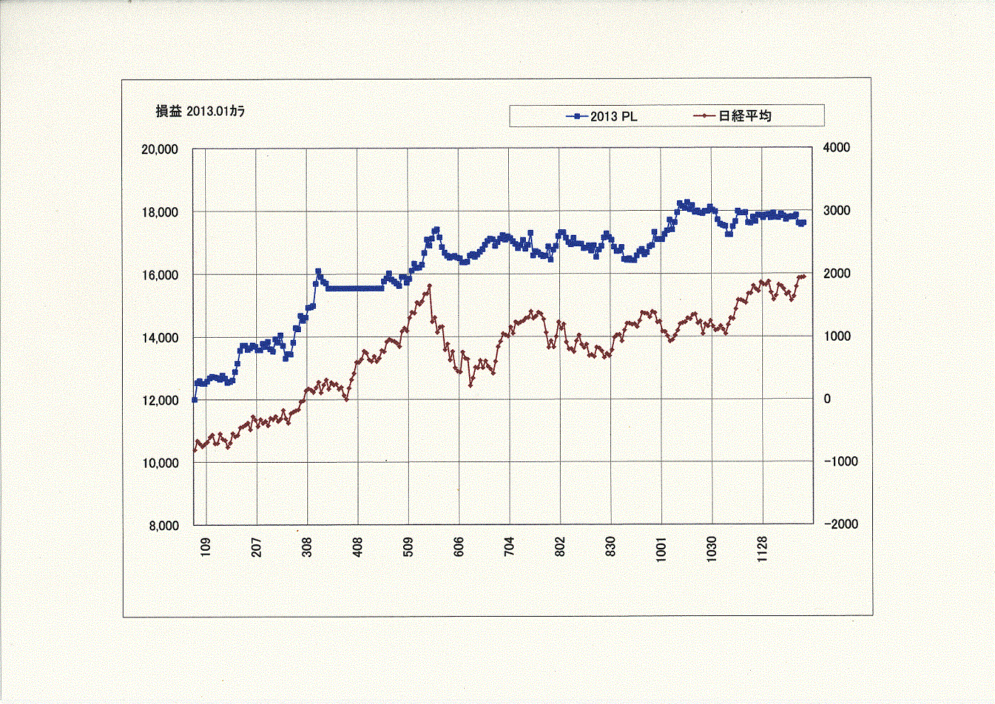 少し早いけれど今年のこれまでの実績をグラフにまとめてみた。利益の推移を日経平均の動きと対比して表示しているが、日経平均が下落しても利益額の減少は少ないので一応満足できる結果であった。しかし、反省点もある。それは保有資金に対して実際に建玉に充てていた資金が少なく寝ている資金が多かったということ。これは安全性を求めすぎたということで、今年前半のようなアベノミクスで「それ行けドンドン」みたいなときはもっと積極的な運用を心掛けるべきであった。ただし、こう言えるのも結果が分かった今だから言えることで、その時点では今後もドンドン行くのかどうかは常に分からない。