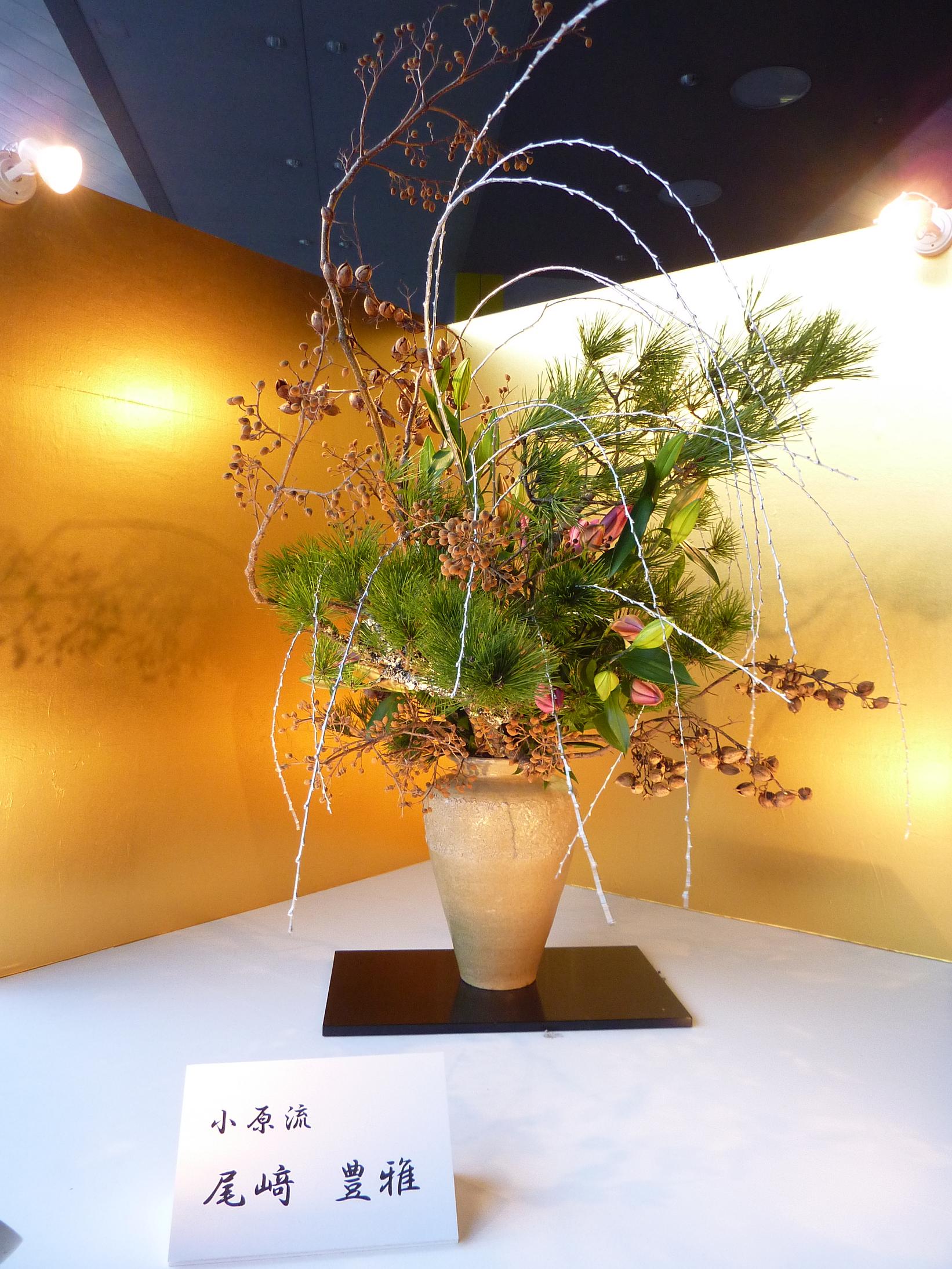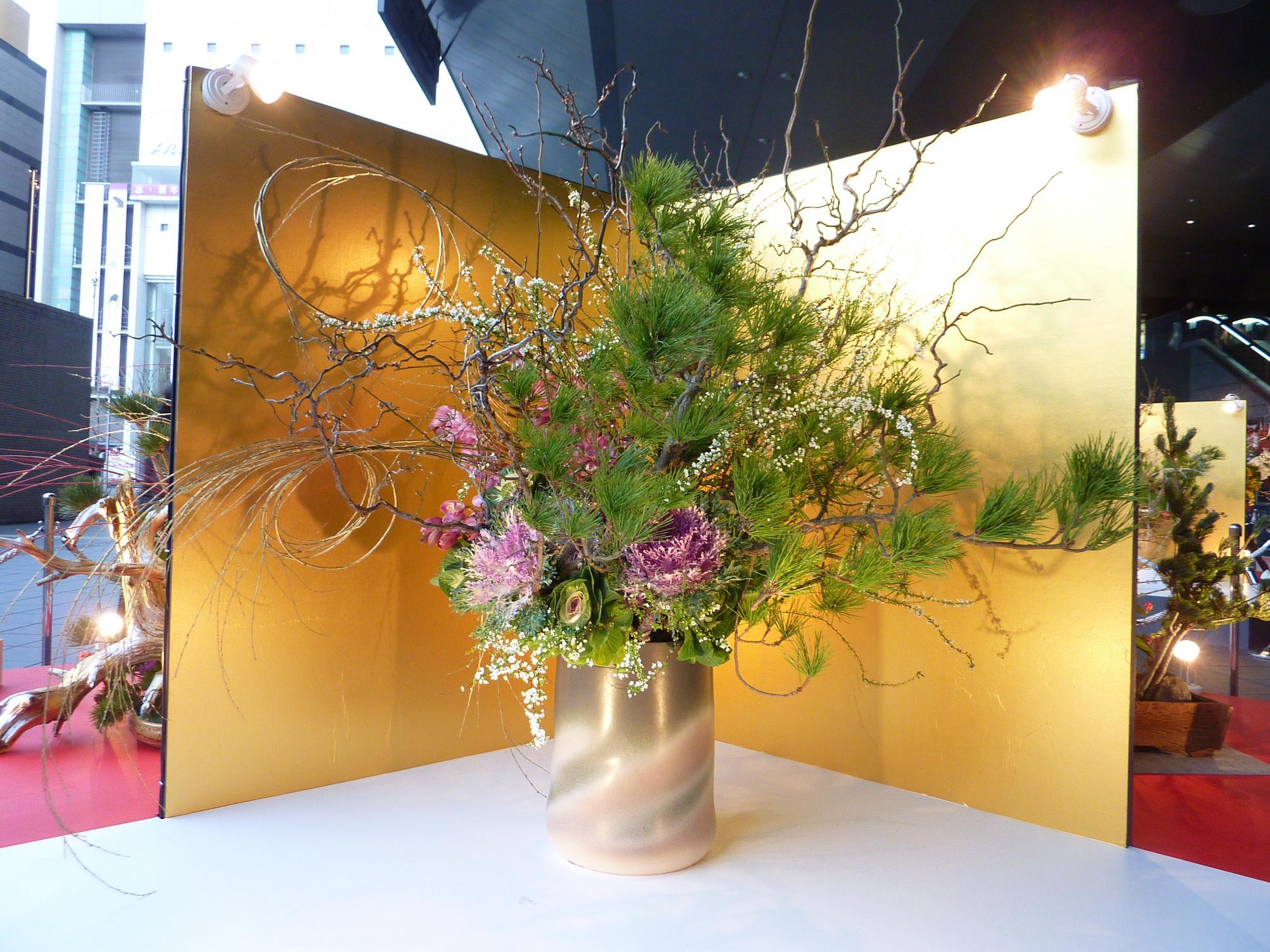 豪華絢爛 金箔の屛風を背景に どれもお正月らしい活け花ですねえ。