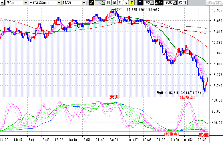 指標ラインの密集点が天底・転換点を示します。指標の見方