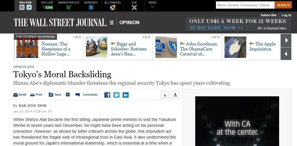 そのうえ、欧米マスコミにいる日本人記者が欧米人向けに日本に非があるかのような記事を書いている(タイトルで靖国をWarShrineと書いてるので、これを見た欧米人には日本=悪者イメージになる。戦死者の慰霊、追悼の神社を戦争の神社とし、そこに首相が行くと書けば、それだけで日本=悪となる。 和訳のほうではWarShrineのニュアンスを消して中立記事を装ってるのでかなり狡猾)。