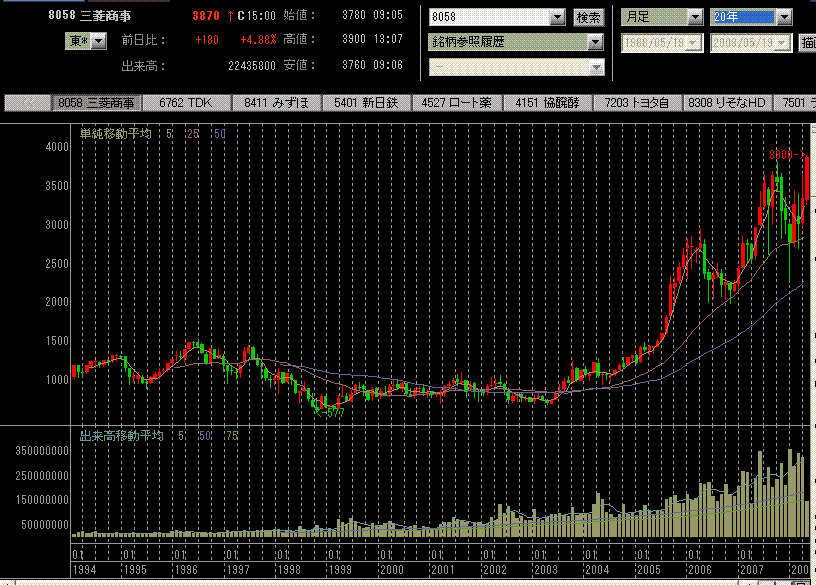 原油高から世界的に資源関連株が買われていることを受けて、商社、鉱業、石油、鉄鋼、非鉄あたりに買いが入りました。TOPIXは6連騰。三菱商事は上場来高値更新。鉄鋼は、日興シティによる目標株価引き上げがあったみたいで、それも効いたようです。メガバンクも、アメリカの金融セクターが弱い割に強かったです。長期国債先物が買われていたためか、日経平均先物への売り圧力は結構あったのですが、特定の大型株はぐいぐい買われていました。物色の対象外の銘柄は放置されていましたが。