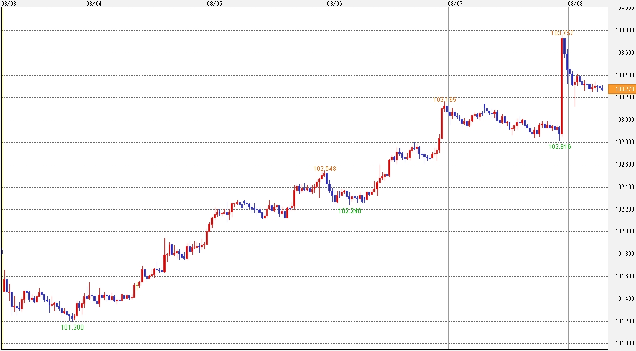 3月3日~3月7日の週。ドル円相場は1ドル=101.20~103.75円
