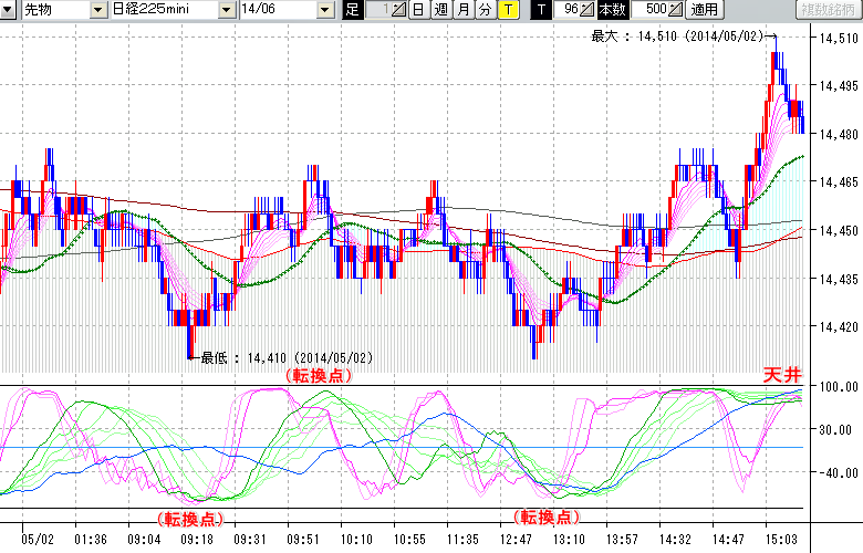 指標ラインの密集点が天底・転換点を示します。指標の見方